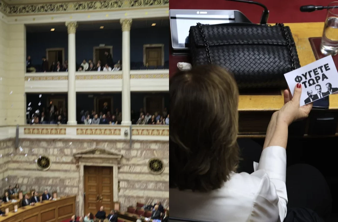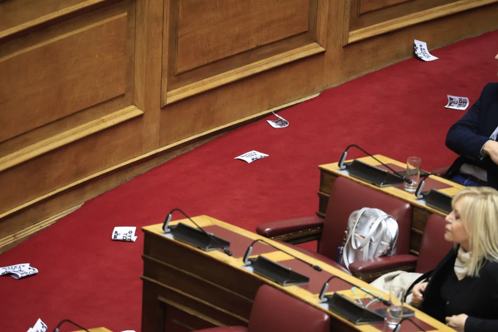 Οι άγνωστοι άρχισαν να φωνάζουν, με αποτέλεσμα να επέμβει η φρουρά της Βουλής. Επικράτησε ένταση στην αίθουσα, με βουλευτές της ΝΔ να αντιδρούν και τον πρόεδρο της Βουλής να τους καλεί να ηρεμήσουν.
