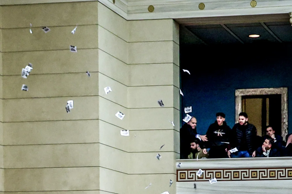 Διαδηλωτές που βρίσκονταν στα θεωρεία της Βουλής πέταξαν τρικάκια.