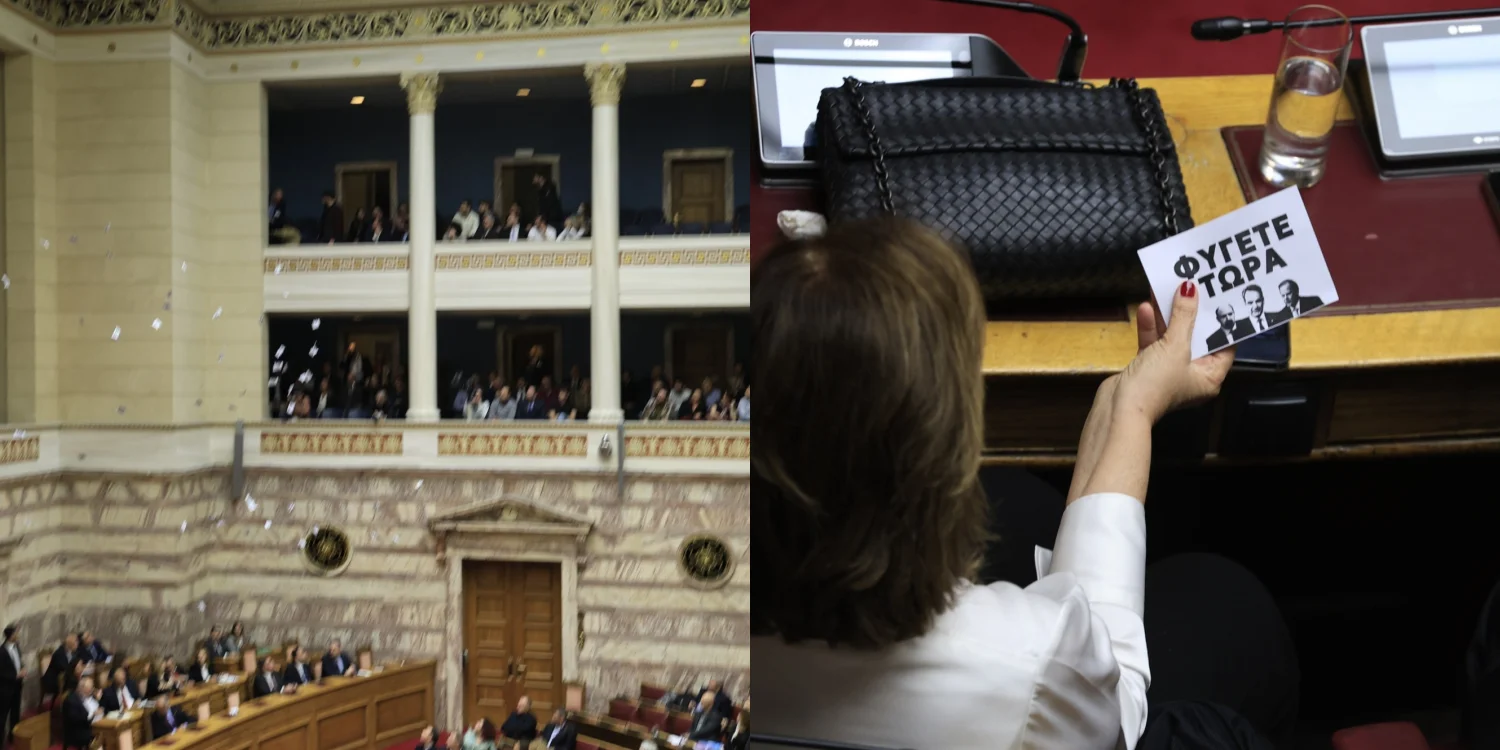Αναστάτωση προκλήθηκε στην αίθουσα της Ολομέλειας της Βουλής, μόλις ανέβηκε στο βήμα ο πρωθυπουργός Κυριάκος Μητσοτάκης, για την ομιλία του επί τις πρότασης δυσπιστίας κατά της κυβέρνησης.