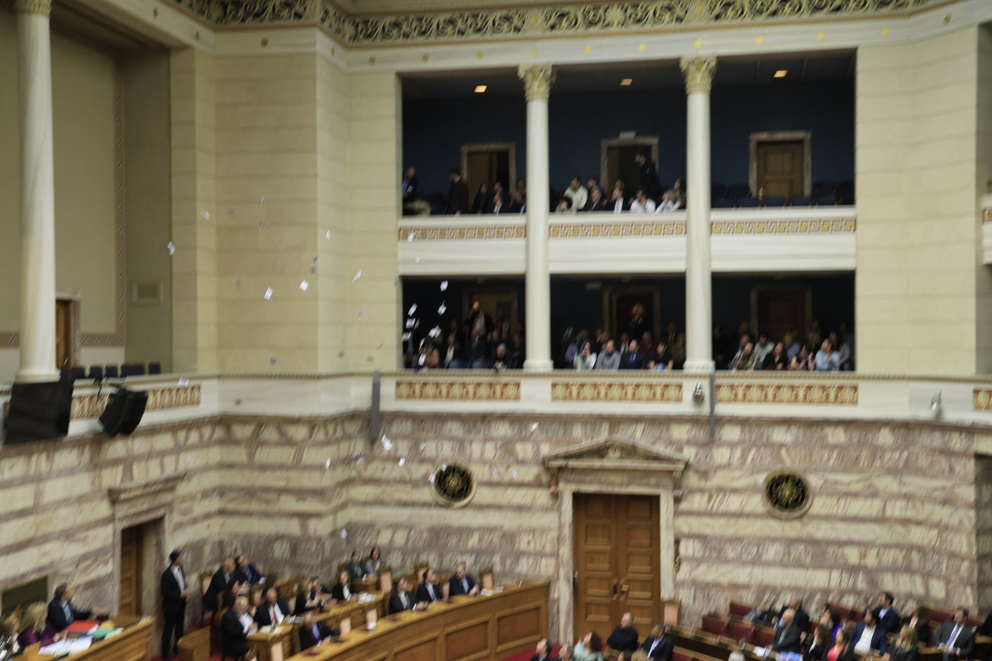 Διαδηλωτές που βρίσκονταν στα θεωρεία της Βουλής πέταξαν τρικάκια.