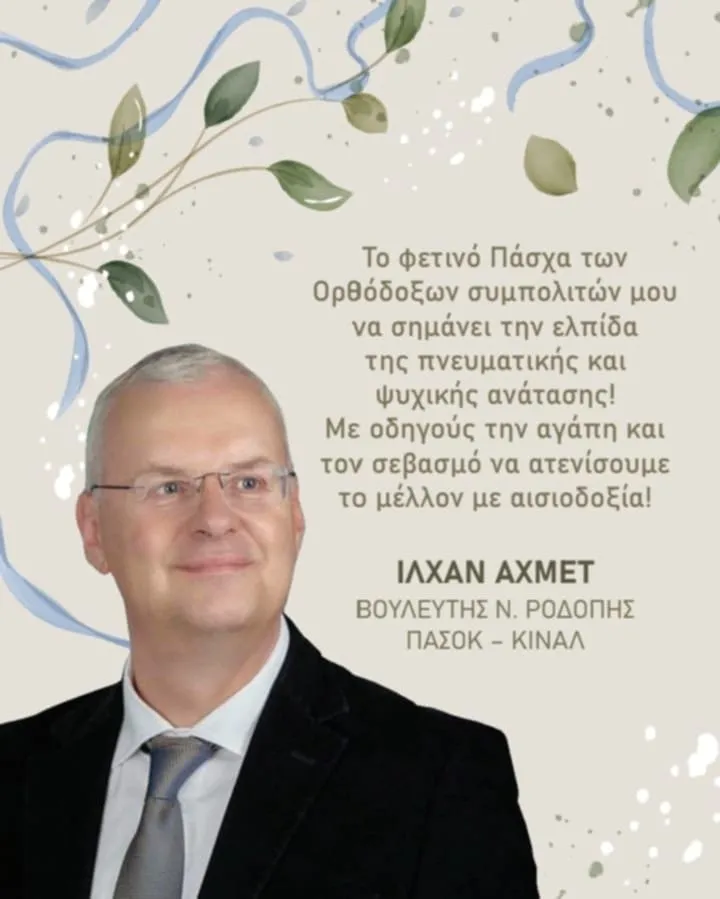 Τις θερμότερες ευχές του για το Πάσχα στους ορθόδοξους συμπολίτες του, εκφράζει ο Βουλευτής Ροδόπης του ΠΑΣΟΚ Ιλχάν Αχμέτ.
