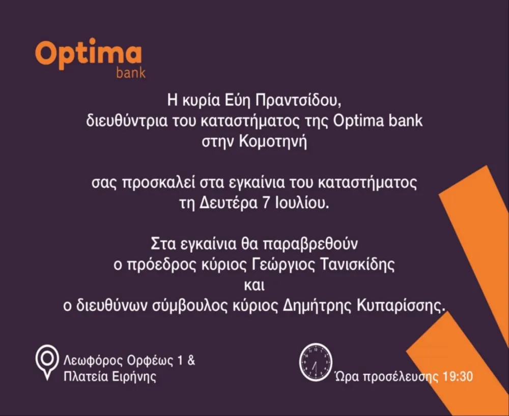 Εγκαινιάζεται τη Δευτέρα 7 Ιουλίου και ώρα 19:30 το νέο κατάστημα της Optima Bank στην Κομοτηνή, παρουσία του προέδρου της τράπεζας κ. Γεωργίου Τανισκίδη και του διευθύνοντος συμβούλου κ. Δημήτρη Κυπαρίσση.