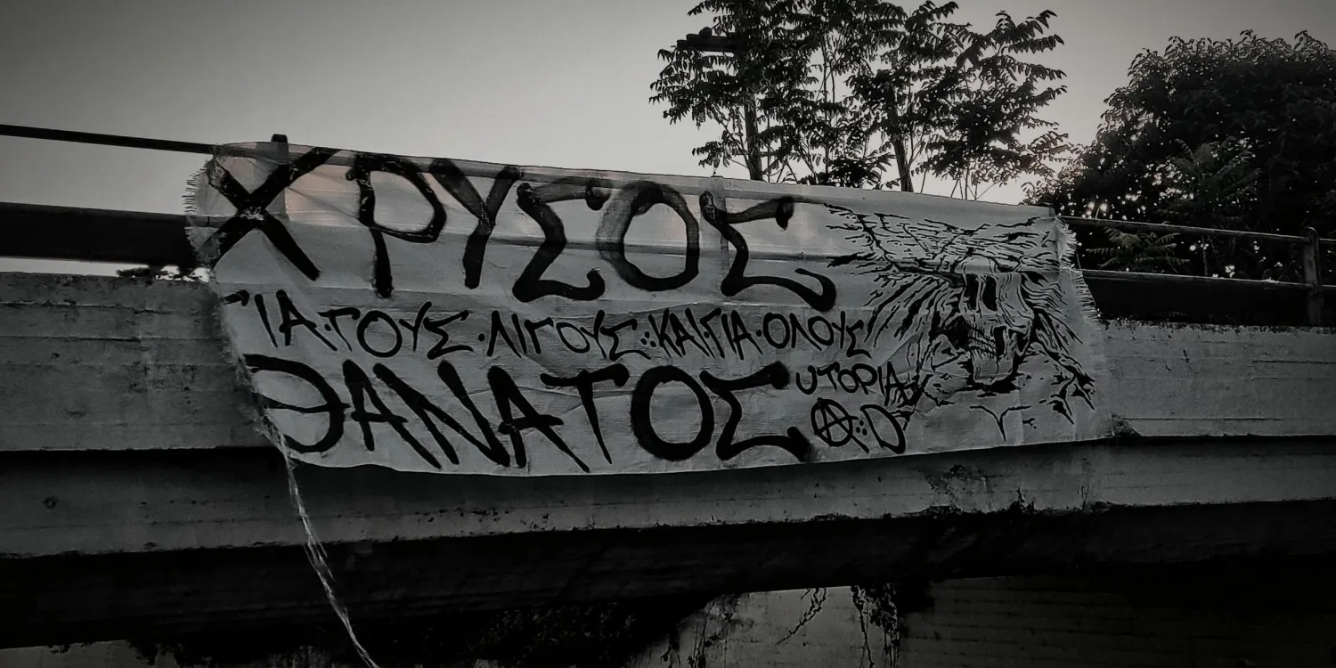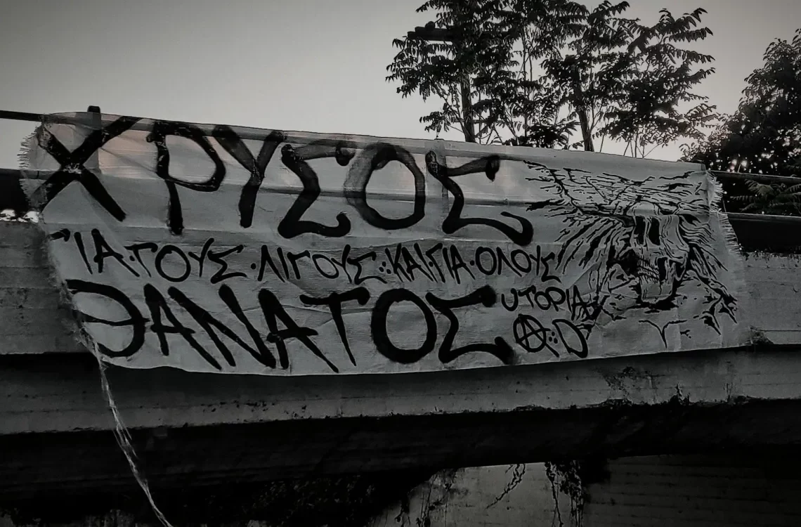 Πανό ενάντια στην εξόρυξη χρυσού σε Σάπες και Πέραμα, κρέμασε στη γέφυρα στη δυτική είσοδο Κομοτηνής το Αναρχικό Στέκι Utopia AD.