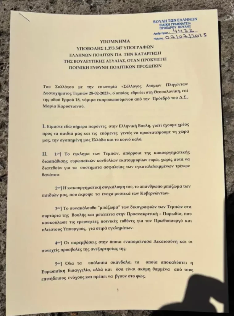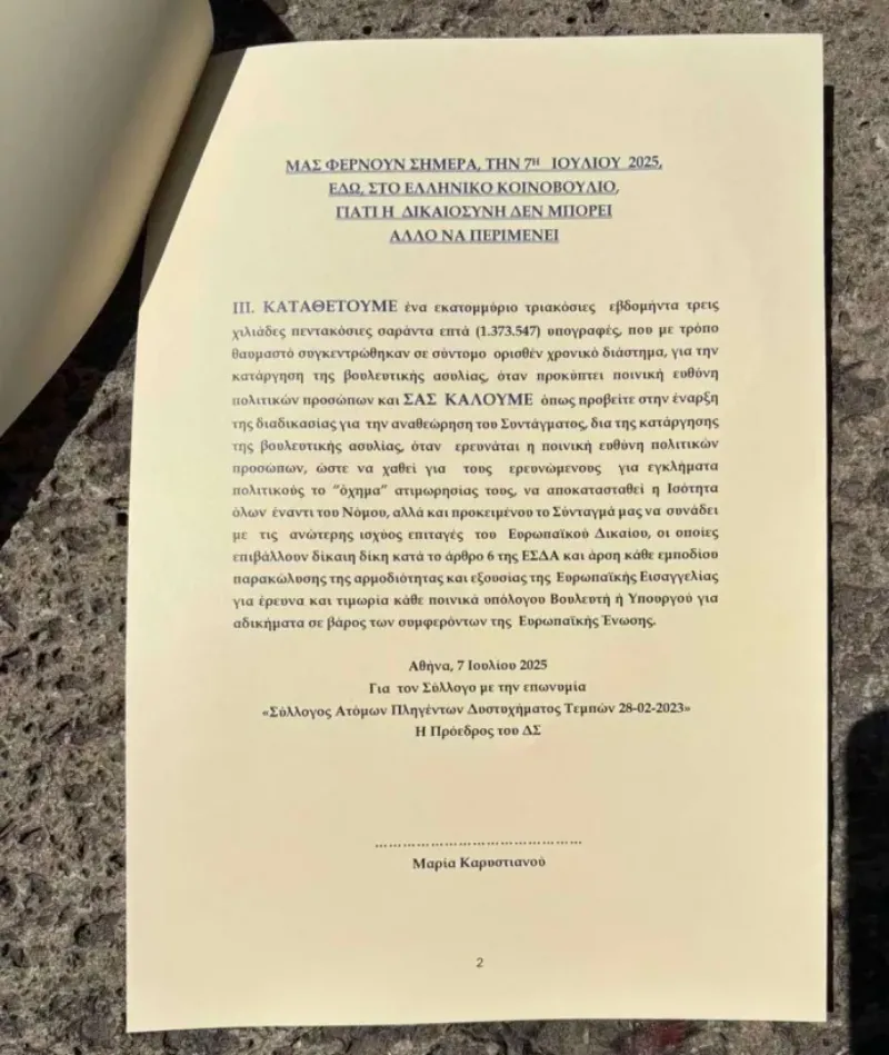 Υπόμνημα με 1,3 εκατ. υπογραφές πολιτών που ζητούν την κατάργηση της βουλευτικής ασυλίας, όταν ερευνάται η ποινική ευθύνη πολιτικών προσώπων, κατέθεσε η Μαρία Καρυστιανού τη Δευτέρα 7 Ιουλίου στη Βουλή.