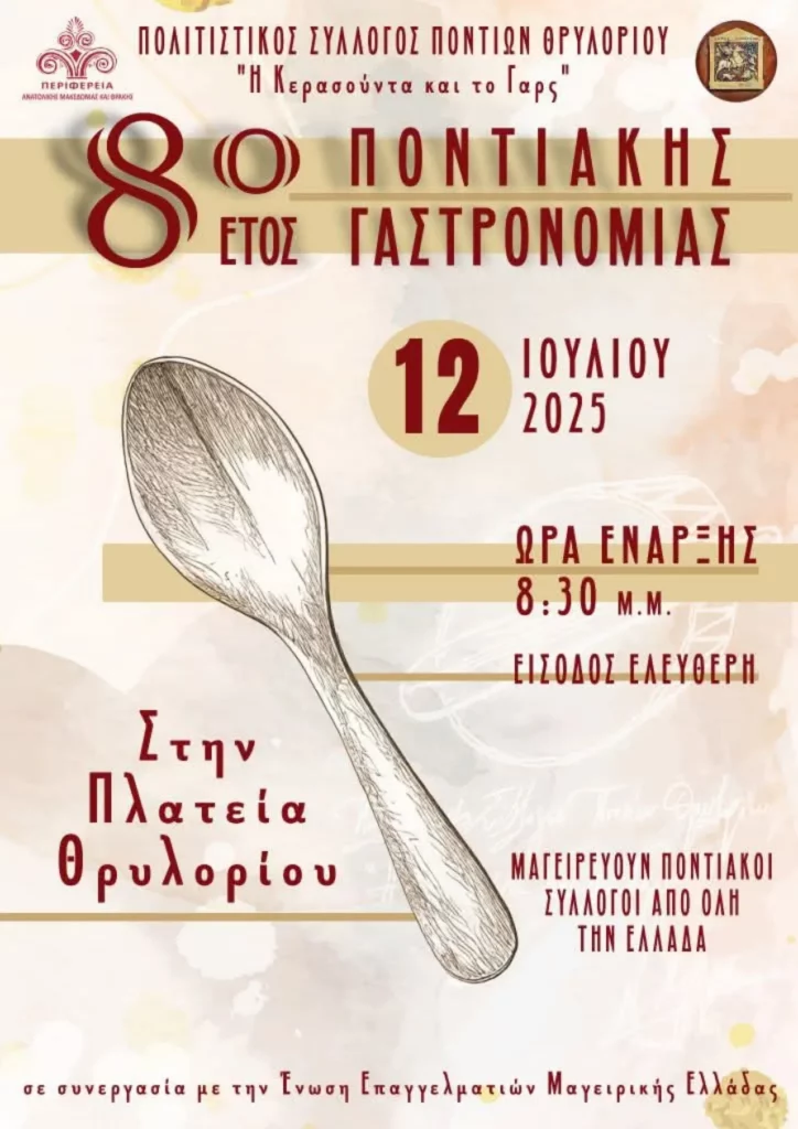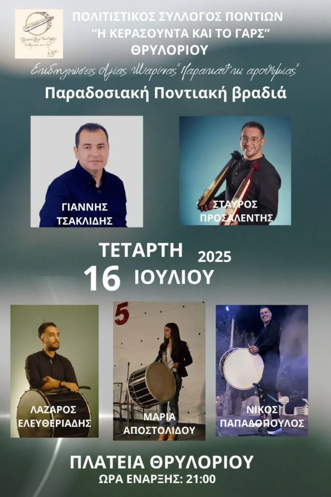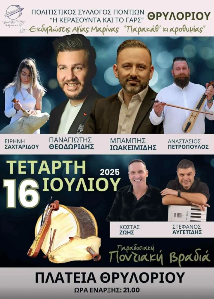 Ο Πολιτιστικός Σύλλογος Ποντίων Θρυλορίου «Η Κερασούντα και το Γαρς» προσκαλεί μικρούς και μεγάλους στις καθιερωμένες εορταστικές εκδηλώσεις προς τιμήν της Αγίας Μαρίνας «Παρακάθ’ κι αροθυμίας», οι οποίες θα πραγματοποιηθούν στο Θρυλόριο από το Σάββατο 12 έως την Πέμπτη 17 Ιουλίου 2025.