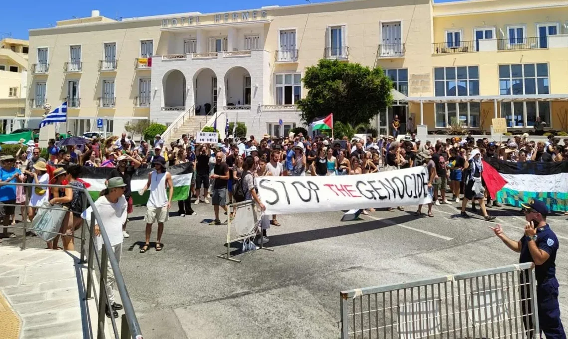 Σύμφωνα με το cyclades24.gr, στη συγκέντρωση συμμετείχαν μέλη τοπικών συλλόγων, σωματείων και πολίτες οι οποίοι ανύψωσαν μεγάλες σημαίες της Παλαιστίνης και ένα πανό με το σύνθημα: «Stop the Genocide» στέλνοντας το δικό τους πολιτικό μήνυμα για όσα συμβαίνουν στη Μέση Ανατολή.