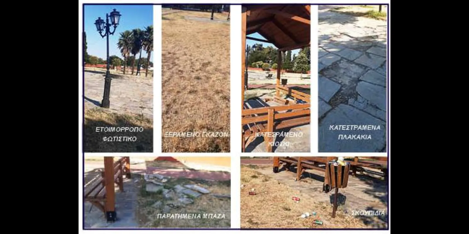 Ξεκινώντας  από το ελλιπές πότισμα των δέντρων , το ξεραμένο γκαζόν, την ανύπαρκτη περιποίηση κάθε είδους φυτών, τον φωτισμό που είχε να λειτουργήσει τρείς μήνες, τα σπασμένα παγκάκια , τις φθορές στα στέγαστρα που εγκυμονούν πολλούς κινδύνους, την έλλειψη καθαριότητας, μπορεί εύκολα να διαπιστώσει ακόμη κανείς και να παρατηρήσει σπασμένες βρύσες, ασυντήρητες κατασκευές, χαλασμένες ζαρντινιέρες ξηλωμένα πλακάκια και πέτρες, μπάζα κοντά στους διαδρόμους ετοιμόρροπα φωτιστικά, απεριποίητα παρτέρια, λακκούβες, τρύπες και πολλά άλλα.