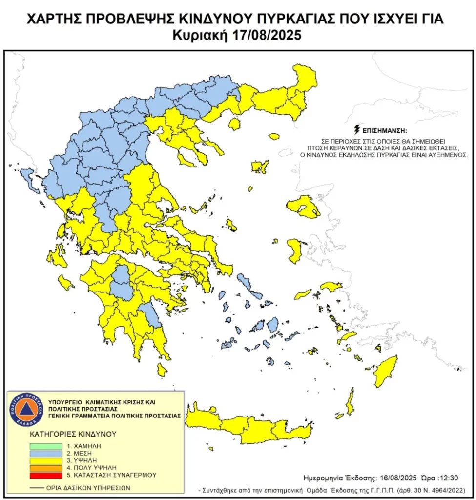 Σύμφωνα με τον Χάρτη Πρόβλεψης Κινδύνου Πυρκαγιάς της Γενικής Γραμματείας Πολιτικής Προστασίας, για αύριο Κυριακή 17 Αυγούστου 2025, η Π.Ε. Ροδόπης τίθεται σε κατηγορία υψηλού κινδύνου (κατηγορία 3).