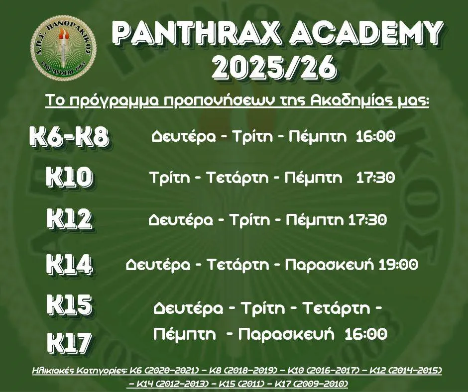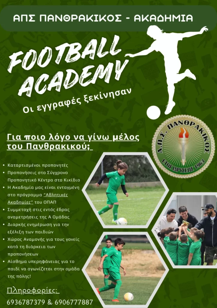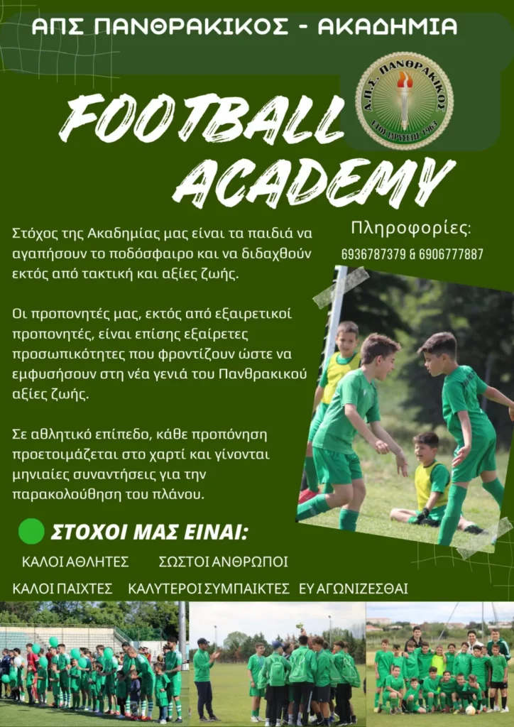 Η Ακαδημία του Πανθρακικού ετοιμάζεται να υποδεχθεί για μία ακόμη σεζόν τη νέα γενιά της πόλης, προσφέροντας στα παιδιά τη δυνατότητα να αγαπήσουν το ποδόσφαιρο, να βελτιώσουν τις δεξιότητές τους και να ενσωματώσουν αξίες ζωής που υπερβαίνουν το γήπεδο.