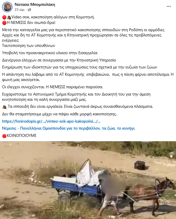 Η πρόεδρος της «Νέμεσις», που επισυνάπτει το σχετικό δημοσίευμα της «Φωνής της Ροδόπης» στην ανάρτηση της, προσθέτει πως το Αστυνομικό Τμήμα Κομοτηνής και η Κτηνιατρική Υπηρεσία προχώρησαν σε όλες τις προβλεπόμενες ενέργειες, ενώ παράλληλα ενημερώθηκαν οι ιδιοκτήτες για τις υποχρεώσεις τους σε ό,τι αφορά την ευζωία των ζώων.