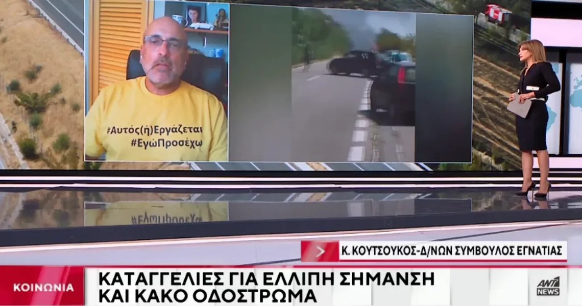 Στο κεντρικό δελτίο ειδήσεων του ΑΝΤ1 με τη Μαρία Σαράφογλου μίλησε ο διευθύνων σύμβουλος της Εγνατίας Οδού, Κωνσταντίνος Κουτσούκος, με αφορμή το πολύνεκρο τροχαίο δυστύχημα που σημειώθηκε τη Δευτέρα λίγο πριν τα διόδια Ιάσμου.