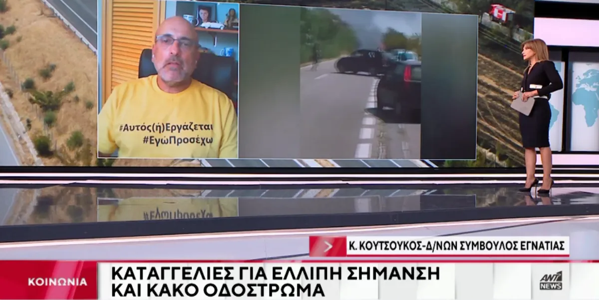 Στο κεντρικό δελτίο ειδήσεων του ΑΝΤ1 με τη Μαρία Σαράφογλου μίλησε ο διευθύνων σύμβουλος της Εγνατίας Οδού, Κωνσταντίνος Κουτσούκος, με αφορμή το πολύνεκρο τροχαίο δυστύχημα που σημειώθηκε τη Δευτέρα λίγο πριν τα διόδια Ιάσμου.