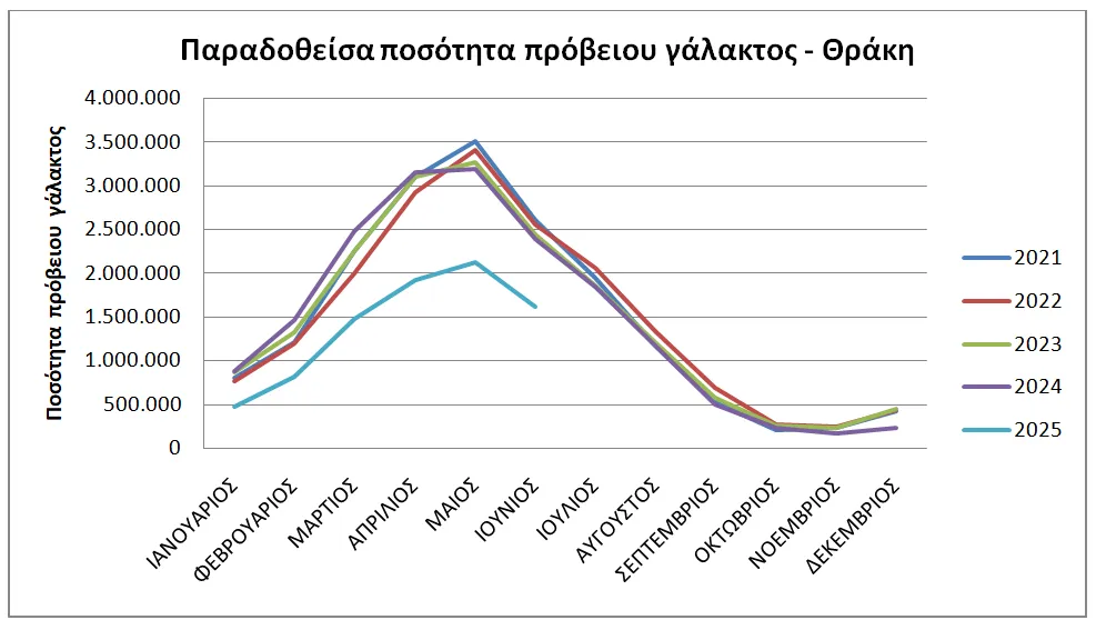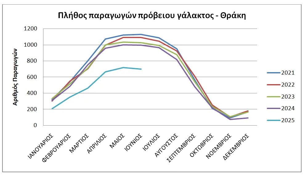 Για το έτος 2024, η προβατοτροφία της Θράκης που σχετίζεται με γαλακτοπαραγωγή, αντιπροσώπευε το 2,5% της εγχώριας παραγωγής γάλακτος. Σύμφωνα με τα τελευταία δημοσιευμένα στοιχεία του ΕΛΓΟ Δήμητρα (έως Ιούνιο 2025), οι μονάδες αιγοπροβάτων στη Θράκη οι οποίες παρέδωσαν πρόβειο γάλα σε γαλακτοβιομηχανίες είναι 299 λιγότερες το 2025 σε σχέση με το 2024, ενώ οι παραδοτέες ποσότητες γάλακτος για το πρώτο εξάμηνο του έτους είναι μειωμένες κατά 40% (13.590.000 kg το 2024 έναντι 8.430.000 kg το 2025).