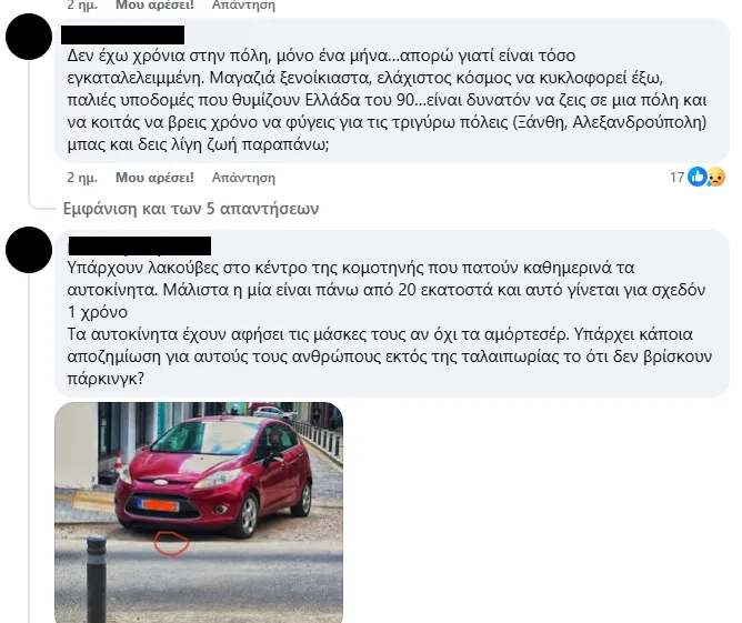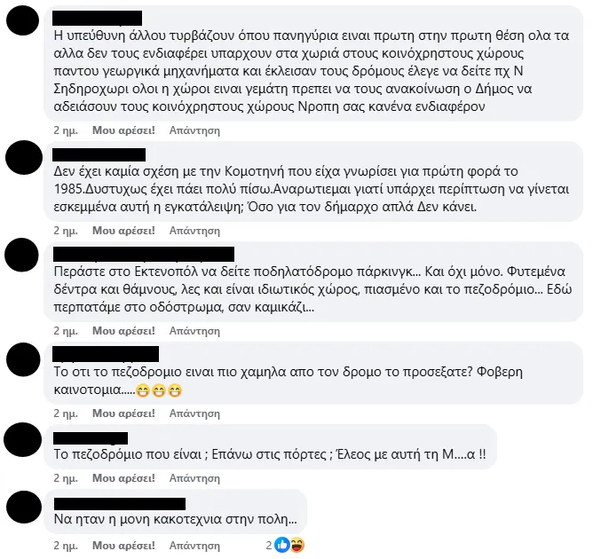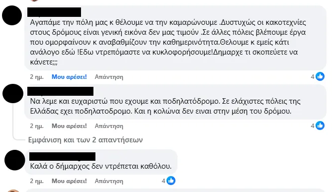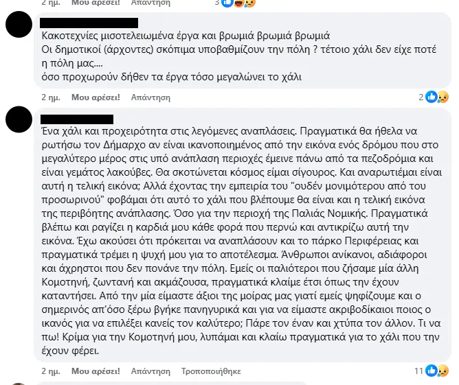 Δεν λείπουν και οι συγκρίσεις με άλλες πόλεις: «Σε άλλες πόλεις βλέπουμε έργα που ομορφαίνουν και αναβαθμίζουν την καθημερινότητα. Εδώ ντρεπόμαστε να κυκλοφορήσουμε».