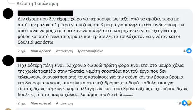 Άλλοι εστιάζουν στην προχειρότητα των έργων: «Ο δρόμος στις υπό ανάπλαση περιοχές έμεινε πάνω από τα πεζοδρόμια και είναι γεμάτος λακούβες. Θα σκοτωθεί κόσμος. Φοβάμαι ότι αυτό που βλέπουμε θα είναι και η τελική εικόνα της περιβόητης ανάπλασης».