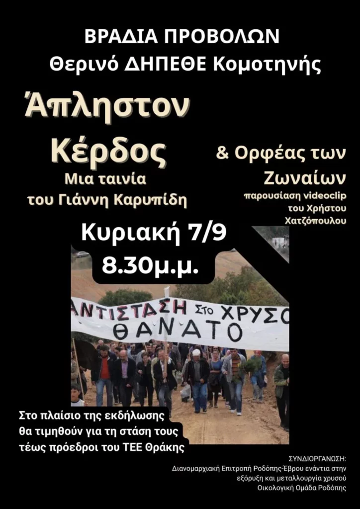 Η Διανομαρχιακή Επιτροπή Ροδόπης – Έβρου ενάντια στην εξόρυξη και μεταλλουργία χρυσού, σε συνεργασία με την Οικολογική Ομάδα Ροδόπης, διοργανώνει εκδήλωση την Κυριακή 7 Σεπτεμβρίου 2025, στις 20:30, στο θερινό Δημοτικό Περιφερειακό Θέατρο (ΔΗ.ΠΕ.ΘΕ.) Κομοτηνής, δίπλα στο Αρχαιολογικό Μουσείο.