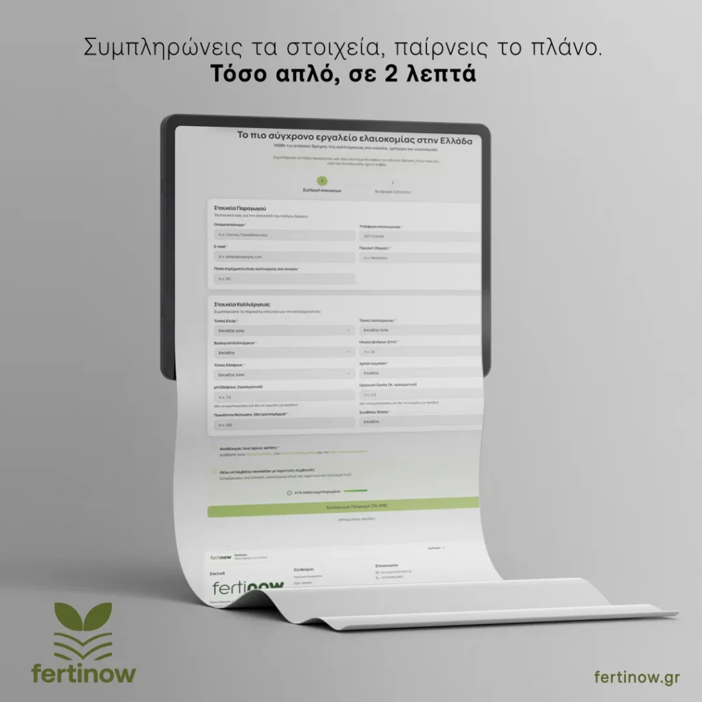 Αμέσως μετά, ο αλγόριθμος της πλατφόρμας επεξεργάζεται τα δεδομένα και, μέσα σε λίγα δευτερόλεπτα, στέλνει στο email του χρήστη ένα πλήρες και εξατομικευμένο πρόγραμμα λίπανσης. Το πρόγραμμα δεν περιλαμβάνει μόνο τις ακριβείς ποσότητες λιπασμάτων που χρειάζεται η καλλιέργεια, αλλά και λεπτομερείς οδηγίες εφαρμογής, χρονοδιαγράμματα και συστάσεις προσαρμοσμένες στις ιδιαίτερες ανάγκες του κάθε ελαιώνα.