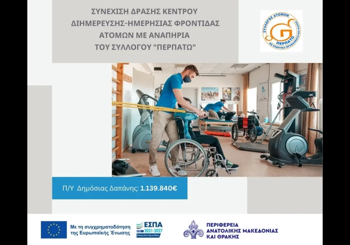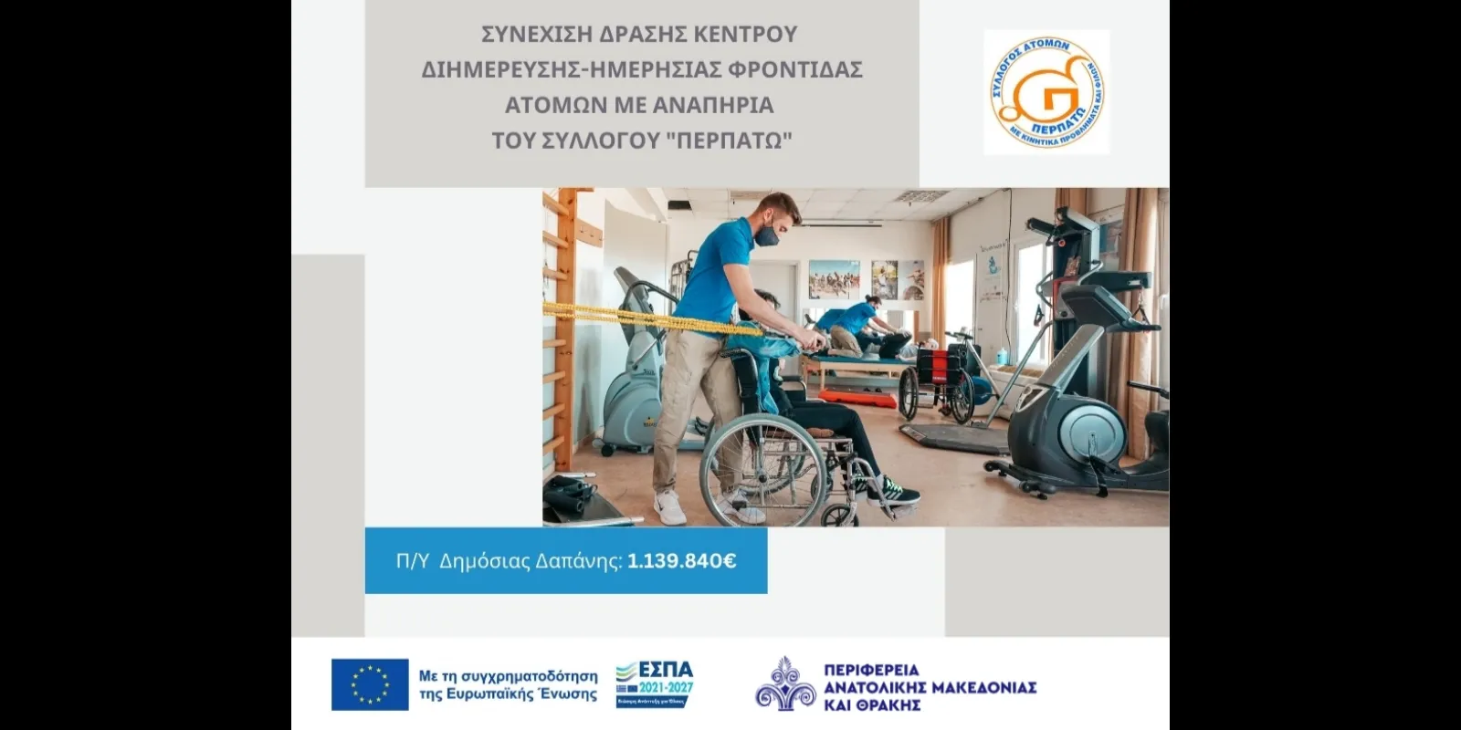 Με απόφαση του Περιφερειάρχη Ανατολικής Μακεδονίας και Θράκης κ. Χριστόδουλου Τοψίδη, συνεχίζεται η Δράση του Κέντρου Διημέρευσης-Ημερήσιας Φροντίδας Ατόμων με Αναπηρία του Συλλόγου «ΠΕΡΠΑΤΩ», με χρηματοδότηση από το Επιχειρησιακό Πρόγραμμα «Ανατολική Μακεδονία, Θράκη» 2021 – 2027, με την συνολική Δημόσια Δαπάνη, μετά την αύξηση, να διαμορφώνεται σε 1.139.840,00 €.