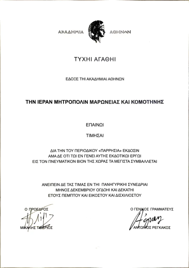 Την Ιερά Μητρόπολη Μαρωνείας και Κομοτηνής τίμησε η Ακαδημία Αθηνών για την εκδοτική της δραστηριότητα, σε τελετή που πραγματοποιήθηκε την Πέμπτη 18 Δεκεμβρίου στην Αίθουσα Τελετών της Ακαδημίας.