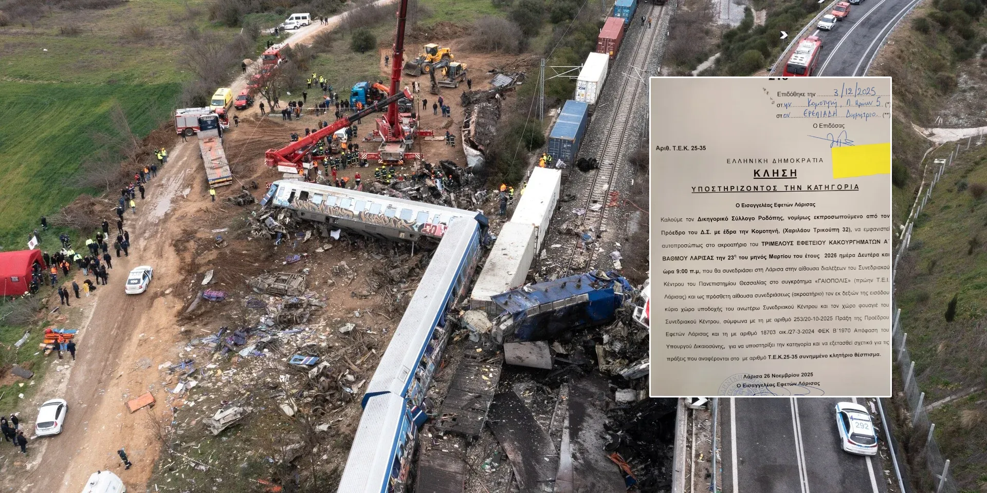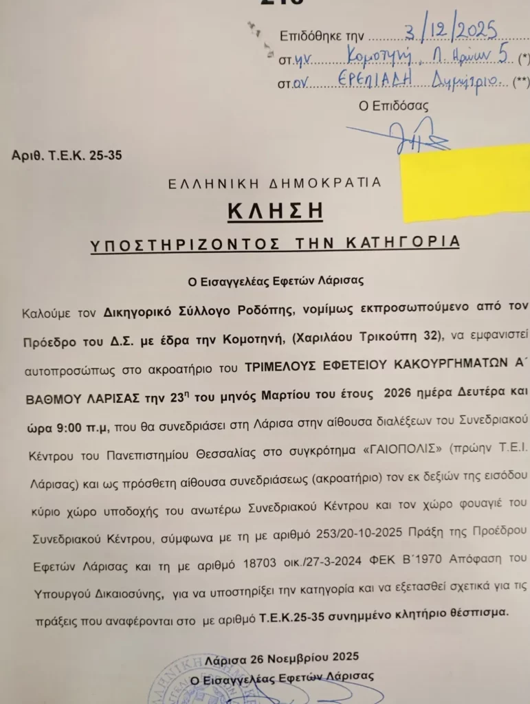 Κλήση για να παραστεί ενώπιον του Τριμελούς Εφετείου Κακουργημάτων Λάρισας έλαβε πριν από λίγες ημέρες ο Δικηγορικός Σύλλογος Ροδόπης, ενόψει της δίκης που έχει προσδιοριστεί για τις 23 Μαρτίου 2026 και αφορά το τραγικό σιδηροδρομικό δυστύχημα των Τεμπών.