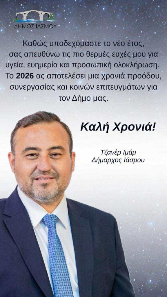 Ο Δήμαρχος Ιάσμου στέλνει τις δικές του εγκάρδιες ευχές, θέτοντας ως προτεραιότητα για το 2026 την πρόοδο του Δήμου μέσα από τη συνεργασία και την κοινή προσπάθεια. Στο μήνυμά του, ο κ. Ιμάμ εστιάζει στην προσωπική ευημερία των πολιτών αλλά και στη δυναμική που μπορεί να αναπτύξει ο τόπος τη χρονιά που ξεκινά.