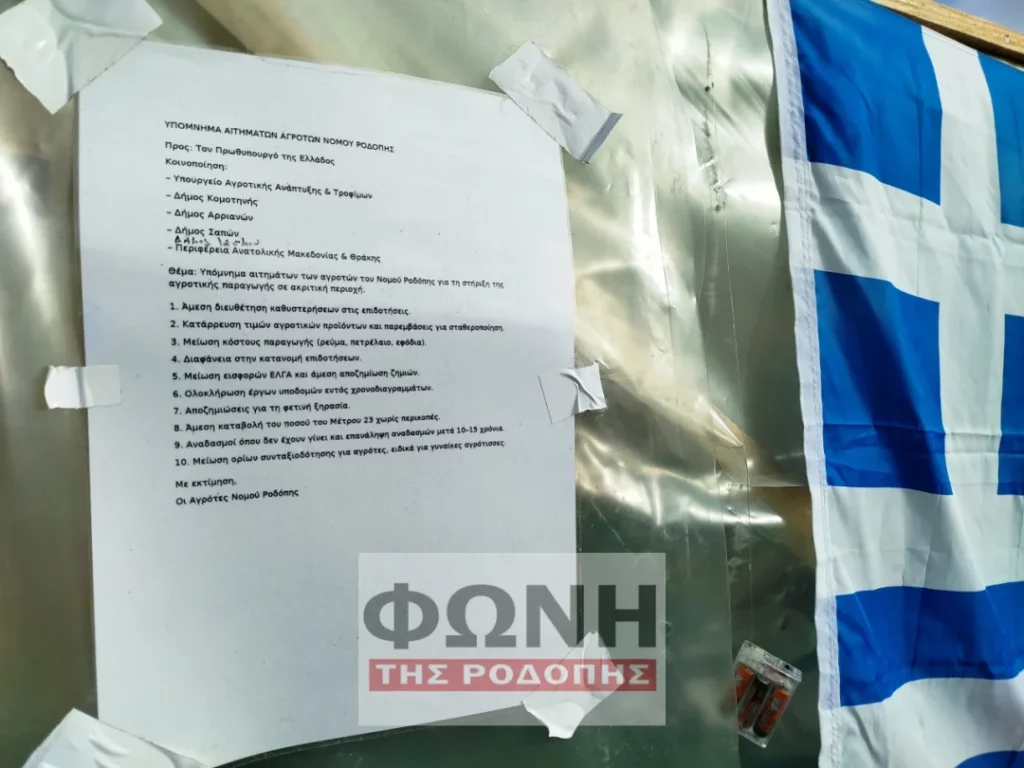 Σε περίοπτη θέση στο Μπλόκο Κομοτηνής, στον δυτικό κόμβο της Εγνατίας Οδού, οι αγρότες της Ροδόπης έχουν αναρτήσει το επίσημο υπόμνημα των αιτημάτων τους, καθιστώντας σαφείς τις προϋποθέσεις για την επιβίωση της αγροτικής παραγωγής στην ακριτική περιοχή.