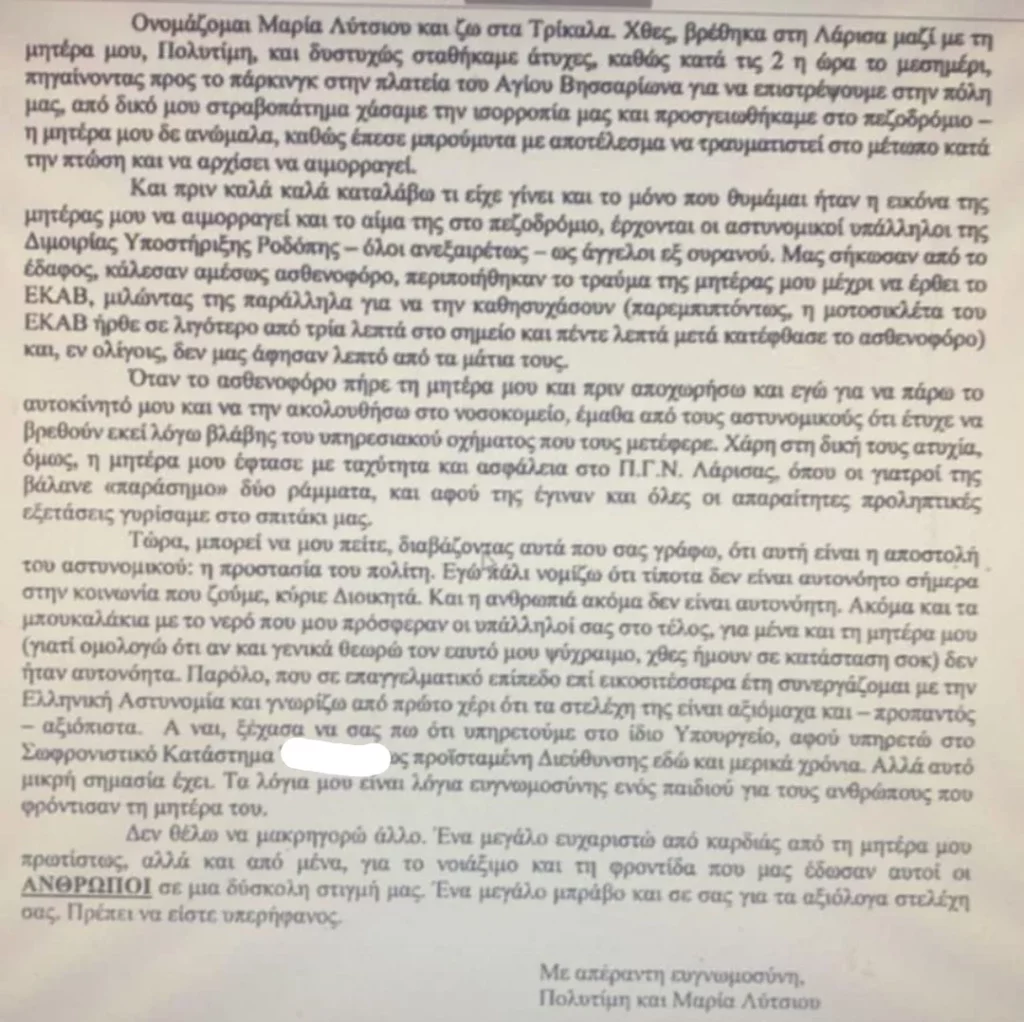 Η κόρη της παθούσας, σε μια ιδιαίτερα συγκινητική επιστολή, χαρακτήρισε τους ένστολους ως «αγγέλους εξ ουρανού», τονίζοντας πως η στάση τους ξεπέρασε τα στενά όρια του καθήκοντος.