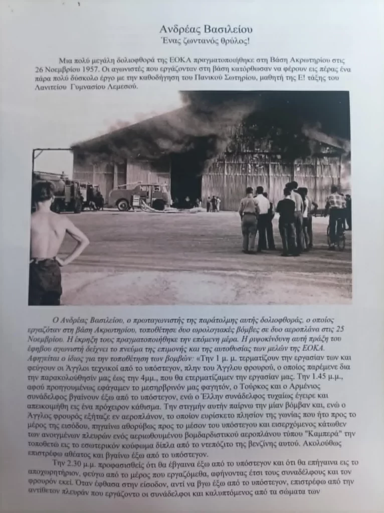 Ο κ. Ανδρέας Βασιλείου, σήμερα 85 ετών, ήταν στα 16 του ο πρωταγωνιστής της πιο εντυπωσιακής αντιστασιακής ενέργειας στη Μεγαλόνησο, ανατινάσσοντας στην αγγλική βάση του Ακρωτηρίου 5 αεροσκάφη και όλη τη συστεγαζόμενη υποδομή. Για την ενέργειά του αυτή έχει τιμηθεί στην Κύπρο αλλά πιστεύουμε ότι οφείλει και ο δήμος μας να τιμήσει στο πρόσωπό του τον αγώνα της ΕΟΚΑ – για παράδειγμα την 1η Απριλίου που είναι και η 71η επέτειος της έναρξης του αγώνα της.