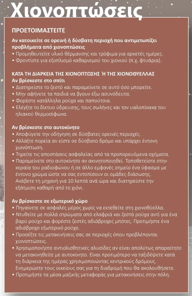 - Προσέξτε τις μετακινήσεις σας σε περιοχές όπου προβλέπονται χιονοπτώσεις.