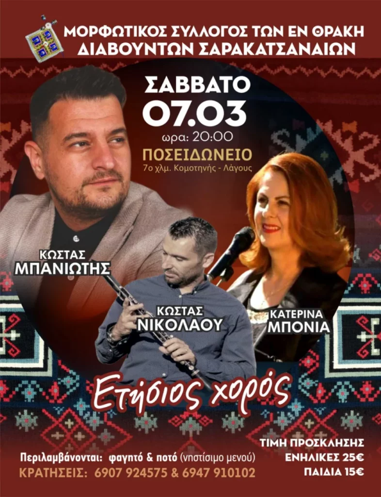 Ο Μορφωτικός Σύλλογος των εν Θράκη Διαβιούντων Σαρακατσαναίων προγραμματίζει την κεντρική ετήσια εκδήλωσή του, προσκαλώντας μέλη και φίλους σε μια παραδοσιακή βραδιά γεμάτη μουσική και χορό. Η εκδήλωση θα πραγματοποιηθεί το Σάββατο 7 Μαρτίου, με ώρα έναρξης τις 20:00.
