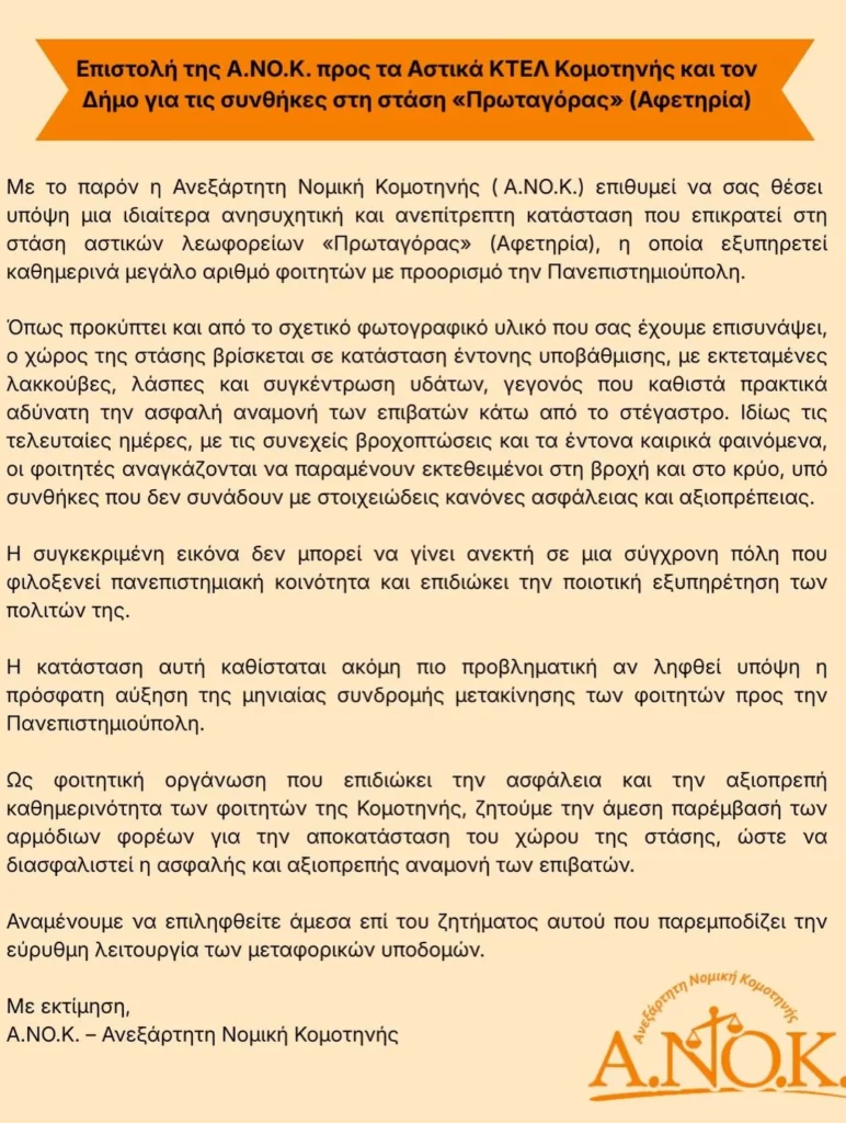 «Με το παρόν η Ανεξάρτητη Νομική Κομοτηνής (Α.ΝΟ.Κ.) επιθυμεί να σας θέσει υπόψη μια ιδιαίτερα ανησυχητική και ανεπίτρεπτη κατάσταση που επικρατεί στη στάση αστικών λεωφορείων “Πρωταγόρας” (Αφετηρία), η οποία εξυπηρετεί καθημερινά μεγάλο αριθμό φοιτητών με προορισμό την Πανεπιστημιούπολη.