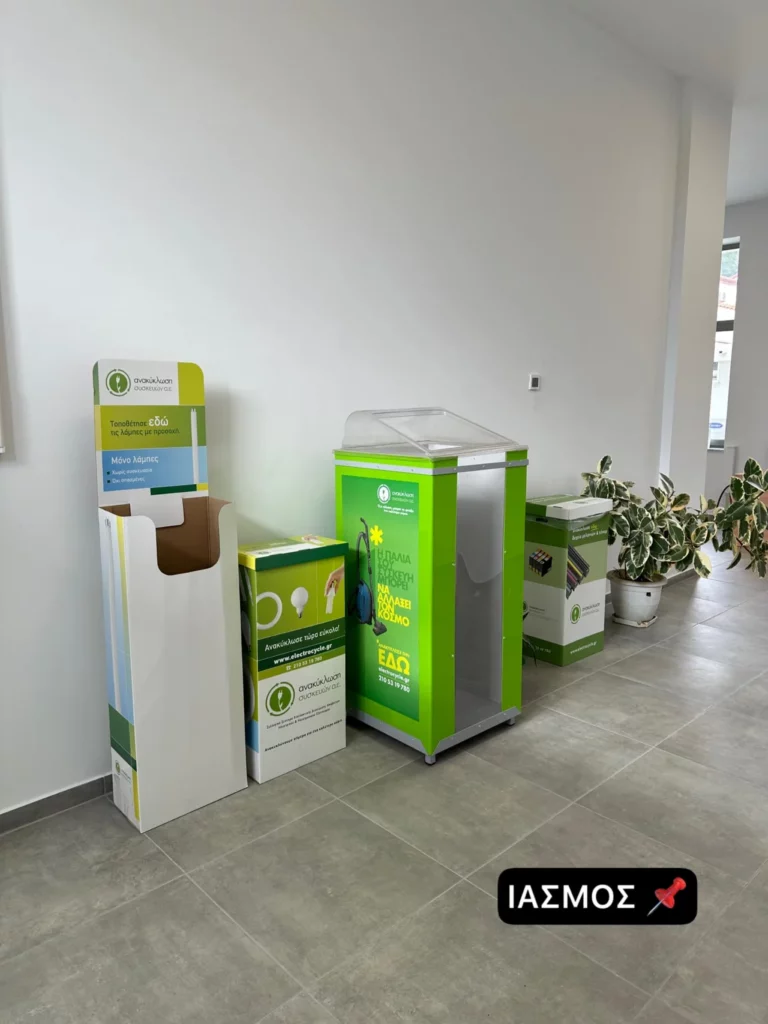 Για λαμπτήρες, τόνερ και μικρές ηλεκτρικές συσκευές, οι κάδοι βρίσκονται στα Δημοτικά Καταστήματα Ιάσμου, Σώστη και Αμαξάδων. Για μεγάλες ηλεκτρικές συσκευές (ψυγεία, τηλεοράσεις), οι δημότες πρέπει να επικοινωνούν με την αρμόδια Υπηρεσία του Δήμου για τη μεταφορά τους στο αμαξοστάσιο».
