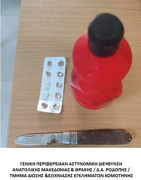 Στην κατοχή της συλληφθείσας βρέθηκαν, εκτός από το δοχείο με το οξύ, ναρκωτικά δισκία και ένα αναδιπλούμενο μαχαίρι. Η υπάλληλος μεταφέρθηκε στο Νοσοκομείο Κομοτηνής, όπου της παρασχέθηκαν οι πρώτες βοήθειες και αποχώρησε, ενώ τα κλεμμένα κοσμήματα επιστράφηκαν στην ιδιοκτήτρια.