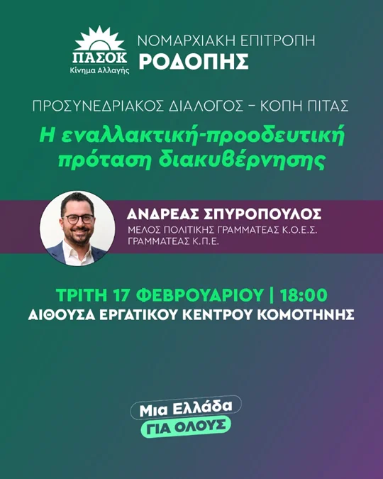 «Η Νομαρχιακή Επιτροπή ΠΑΣΟΚ–Κινήματος Αλλαγής Ροδόπης ανακοινώνει με ιδιαίτερη χαρά τη διοργάνωση ανοιχτής πολιτικής εκδήλωσης, με κεντρικό ομιλητή τον Ανδρέα Σπυρόπουλο, Γραμματέα της Κεντρικής Πολιτικής Επιτροπής και μέλος της Πολιτικής Γραμματείας Κ.Ο.Ε.Σ. Στην πορεία προς το Συνέδριο, καλούμε κάθε δημοκρατικό και προοδευτικό πολίτη να συμμετάσχει σε μια ουσιαστική συζήτηση για τη διαμόρφωση της μόνης αξιόπιστης και σοβαρής εναλλακτικής πρότασης διακυβέρνησης.