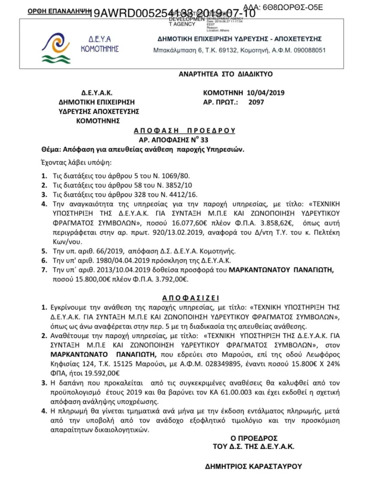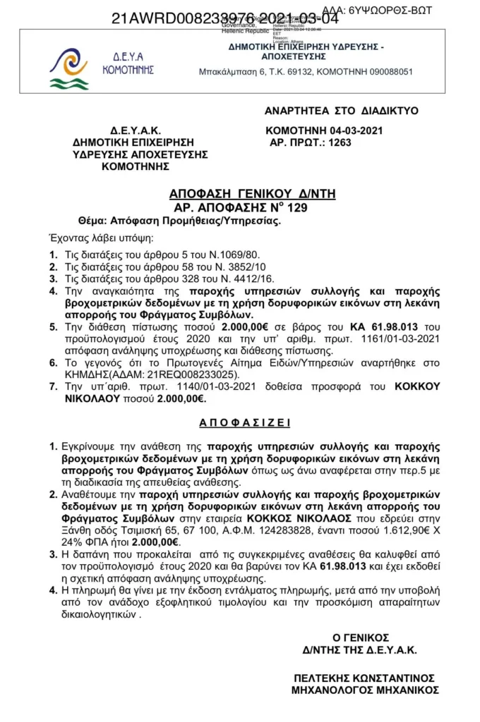 Είναι χαρακτηριστικό ότι η «προσπάθεια ωρίμανσης» την οποία επικαλείται η διοίκηση, εξαντλήθηκε σε μια ανάθεση για αγορά βροχομετρικών δεδομένων ύψους μόλις 1.612 ευρώ. Μια τυπική κίνηση που σε καμία περίπτωση δεν δικαιολογεί την πολυετή καθυστέρηση ενός έργου 19 εκατομμυρίων.