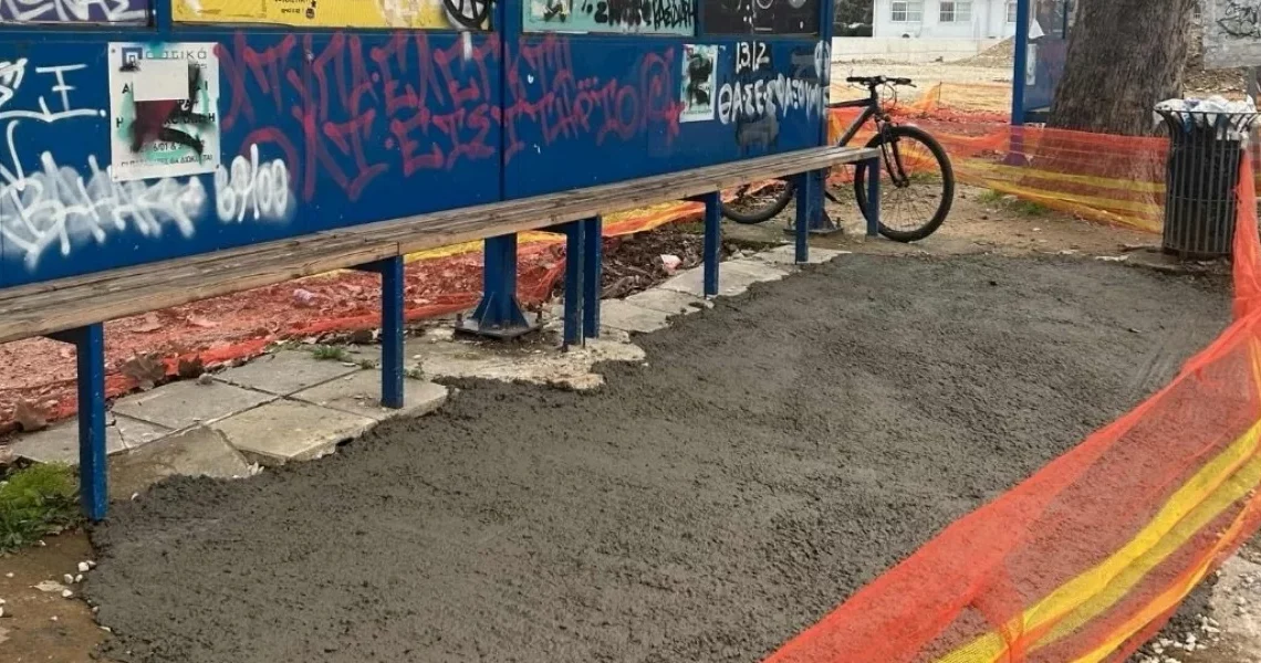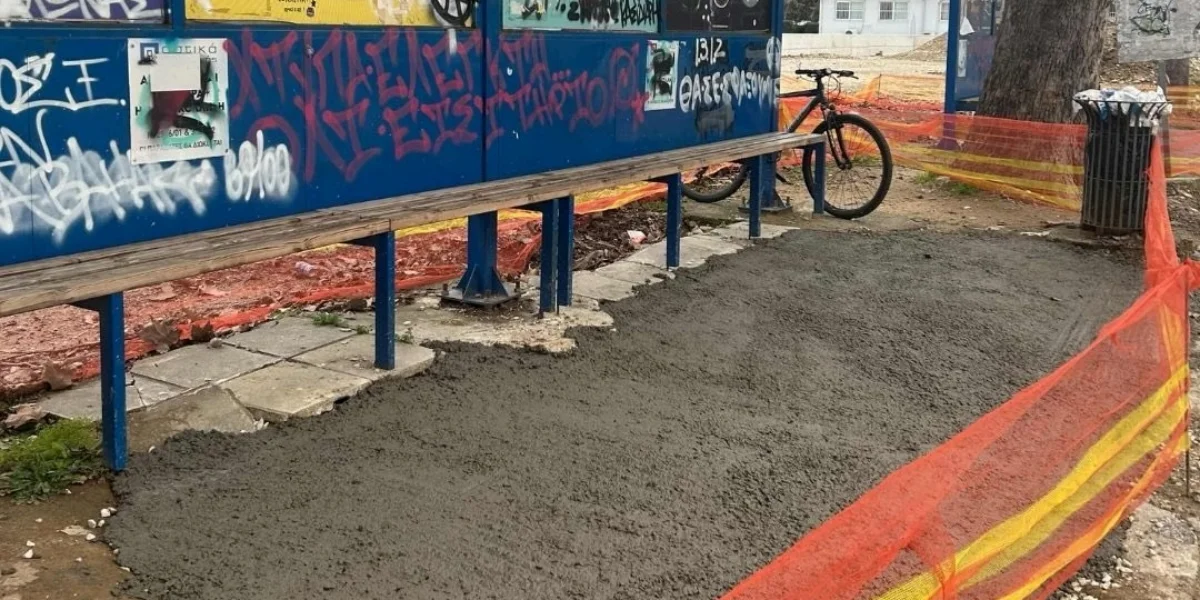 Μετά τις καταγγελίες για λάσπες και λακκούβες που δυσκόλευαν την καθημερινότητα των φοιτητών, ο εργολάβος του έργου ανάπλασης της περιοχής προχώρησε σε εργασίες αποκατάστασης, τοποθετώντας τσιμέντο στον χώρο αναμονής.