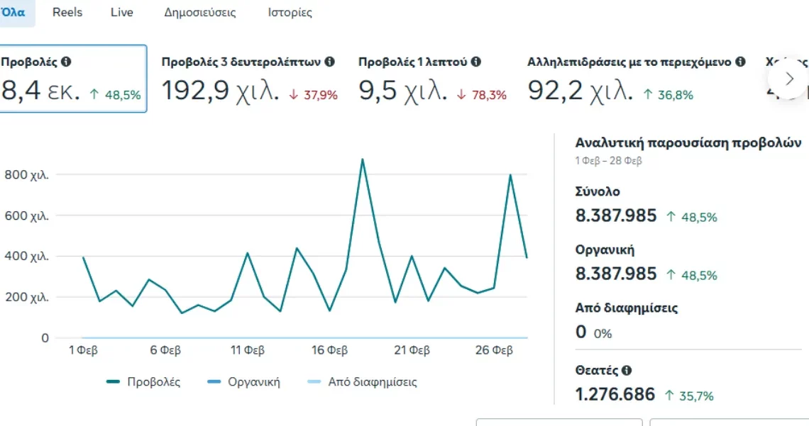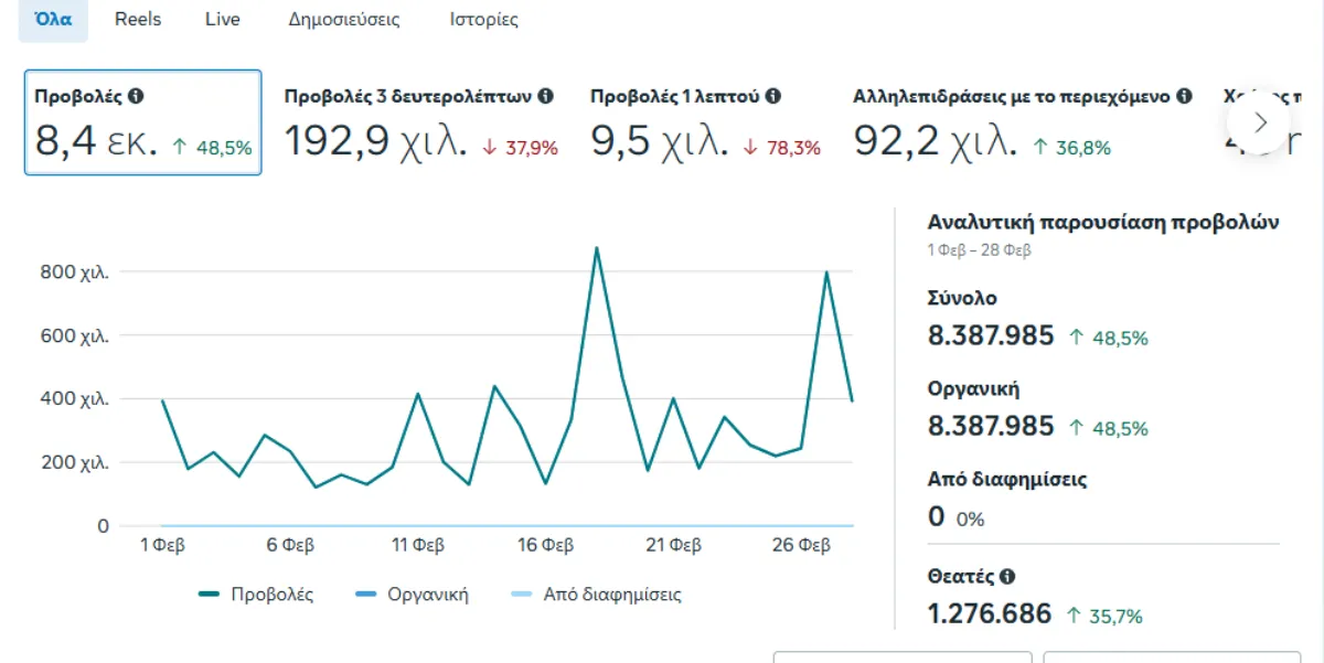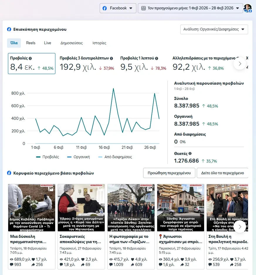 Σύμφωνα με τα επίσημα στατιστικά στοιχεία της Meta, οι προβολές του περιεχομένου μας στο Facebook άγγιξαν τα 8,4 εκατομμύρια, σημειώνοντας άνοδο 48,5% σε σχέση με τον προηγούμενο μήνα.
